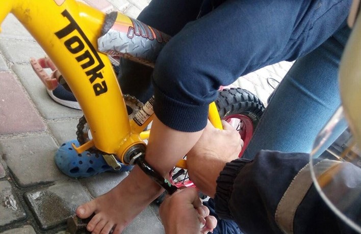 Прибувши на виклик, рятувальники за допомогою гайкового ключа зняли педаль велосипеда і вивільнили ногу дитини.