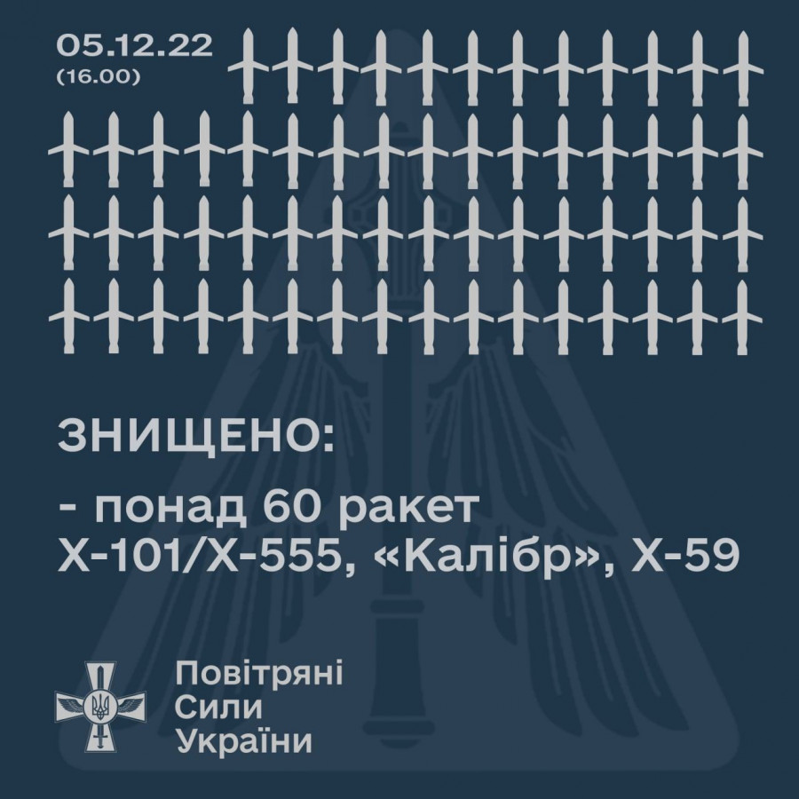 У понеділок, 5 грудня, українські повітряні сили збили більше 60 ракет випущених Росією по території України.
