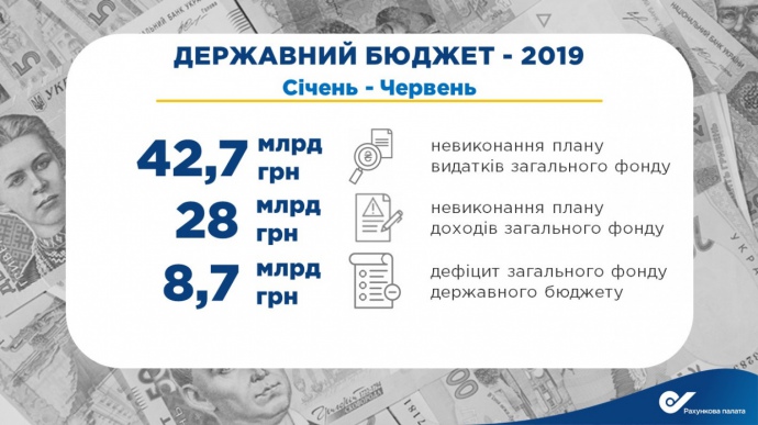 План видатків загального фонду державного бюджету за перше півріччя 2019 року не виконаний на 42,7 мільярда гривень.