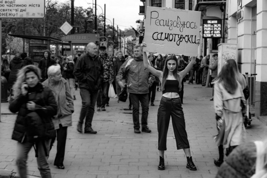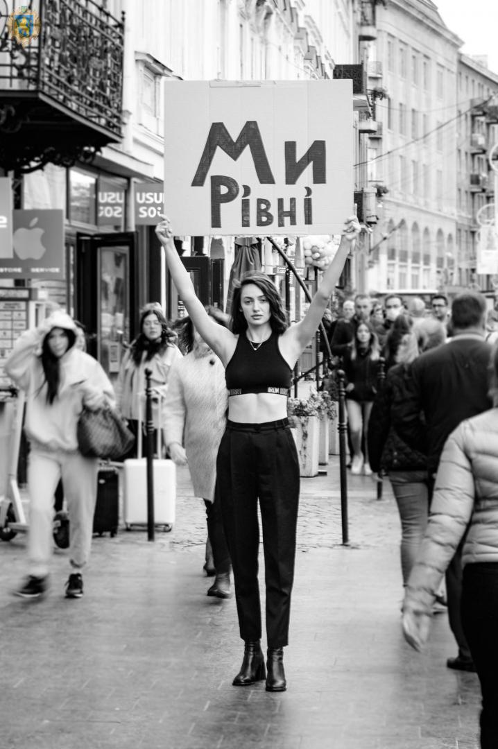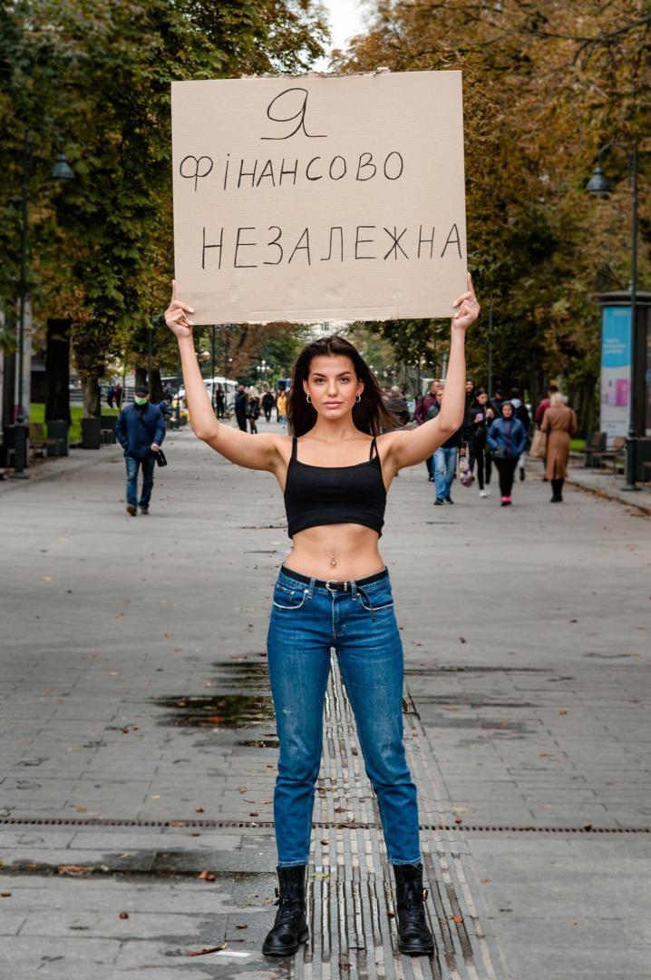 Дівчата вийшли на вулиці Львові з плакатами, на яких написали "Ми рівні", "Не просто красива", Не терплю аб'юз", "Реалізовуюсь самотужки", "Я фінансово незалежна", "Успішна в бізнесі, а не на кухні".