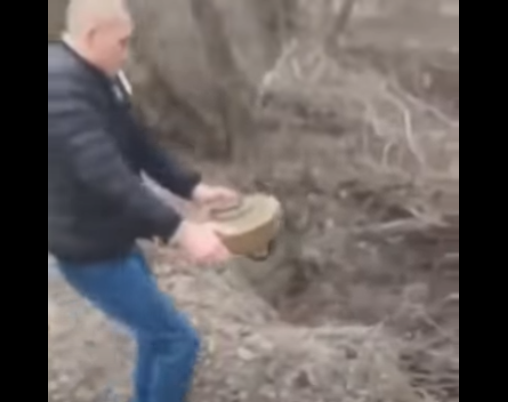 Безстрашний чоловік із цигаркою в зубах голими руками переніс міну в лісосмугу.