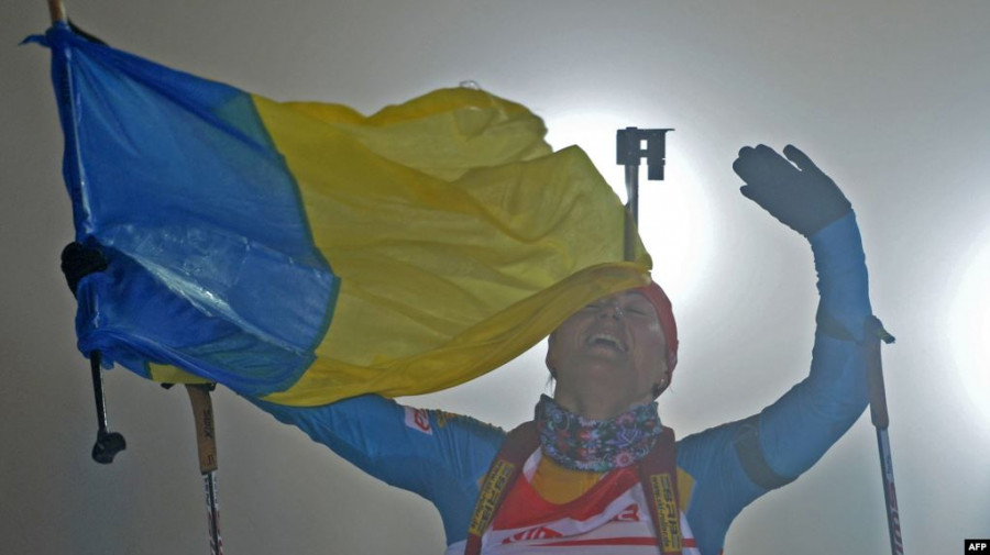 Фото - Віта Семеренко з українським прапором святкує перемогу в класичній естафеті в Обергофі, архівне фото, 2012 рік