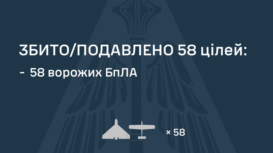За попередніми даними, станом на 08:30, протиповітряною обороною збито/подавлено 58 ворожих БпЛА різних типів на півночі, півдні та сході країни.