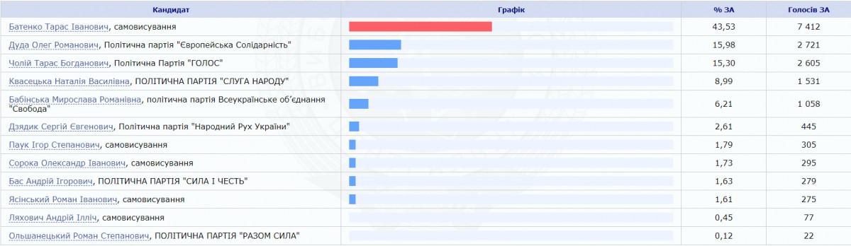 Про це свідчать відомості ЦВК про підрахунок голосів виборців на цьому окрузі. Зокрема, опрацьовано 34,7% протоколів, при цьому Тарас Батенко набирає 43,5% голосів. З великим відривом від конкурентів. Зокрема, на другому місці Олег Дуда - 16%.