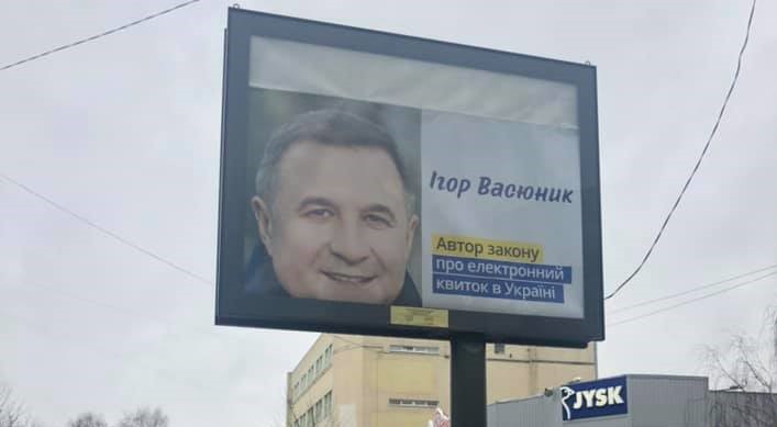 У Львові з’явились біл-борди із фото потенційного кандидата на міського голову Львова Ігоря Васюнника. На бордах напис, який нагадує, що Ігор Васюнник - автор Закону про електронний квиток в Україні.