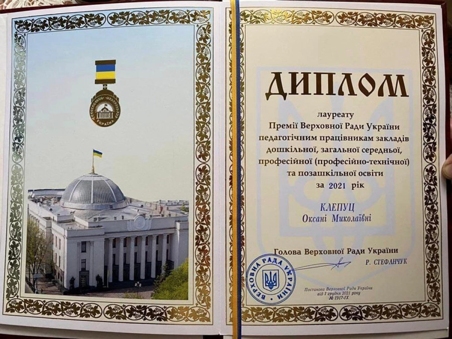 Пані Оксана отримала нагороду — нагрудний знак та Диплом, як лауреатка Премії Верховної Ради України. Премія була присуджена ще у грудні 2021 року. Вручення таких нагород завжди відбувається у Верховній раді на початку наступного року. Але у зв’язку з початком повномасштабної війни це вручення перенесли.