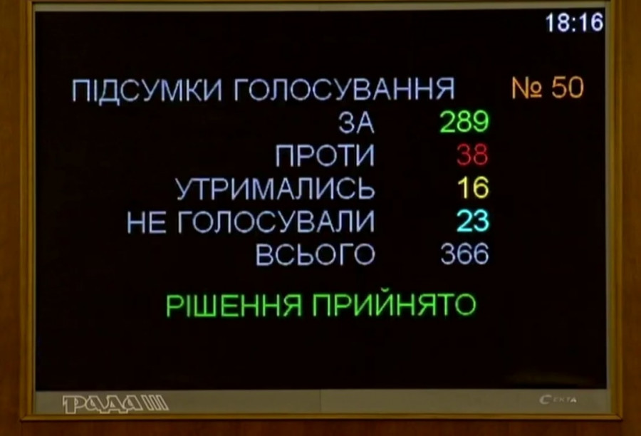 Як передає кореспондент Укрінформу, за відповідне рішення проголосувало 289 народних депутатів.
