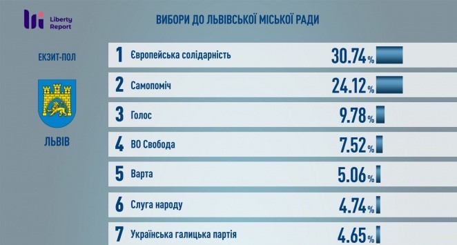 На виборах до Львівської міської ради найбільше місць здобуває "Європейська солідарність", яка набрала 30.74% голосів.