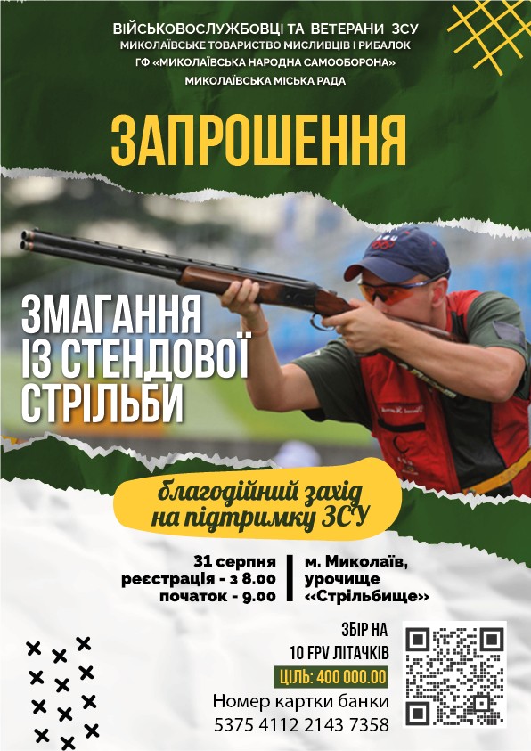 «Запрошуємо мисливців та власників гладкоствольної зброї з Львівщини та України на змагання зі стендової стрільби. Під час заходу відбудуться благодійний ярмарок та аукціон, на яких збиратимемо кошти для купівлі літальних апаратів нашим захисникам. На учасників змагань чекають запашні мисливські страви та смачний десерт. Українську музику виконуватиме народний вокально інструментальний гурт "Сьоме небо" Миколаївського МПК.