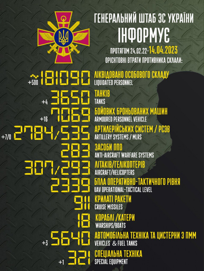 Загальні бойові втрати противника з 24.02.22 по 14.04.23 орієнтовно склали: