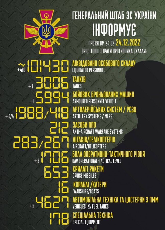 За добу 23 грудня українські військові знищили близько 480 російських загарбників, загалом від початку великої війни втрати армії РФ сягнули 101 430 вояк.