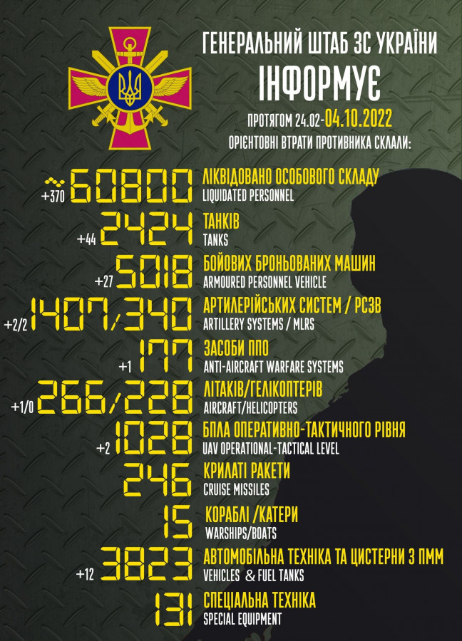 Загальні бойові втрати РФ із 24.02 до 04.10 орієнтовно склали: