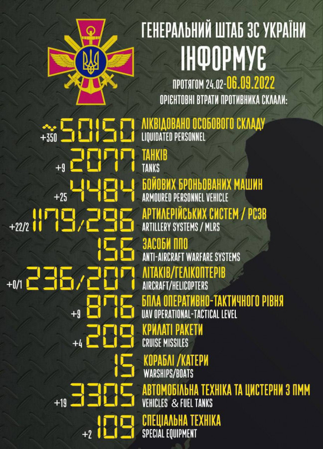 Загальні бойові втрати противника з 24.02 до 06.09 орієнтовно склали: