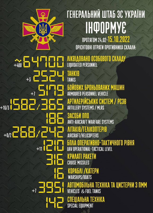 Загальні бойові втрати противника з 24.02 по 15.10 орієнтовно склали: