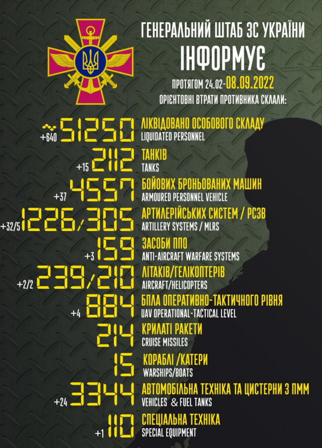 Загальні бойові втрати противника з 24.02 по 08.09 орієнтовно склали: