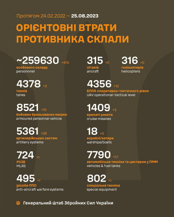 Загальні бойові втрати противника з 24.02.22 по 25.08.23 орієнтовно склали:
