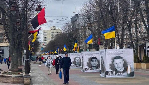 Алея Героїв на вулиці Проскурівській з портретами майже пів сотні захисників України з’явилася 18 лютого. Нещодавно її доповнили ще 12 банерами з іменами загиблих на війні військовослужбовців.