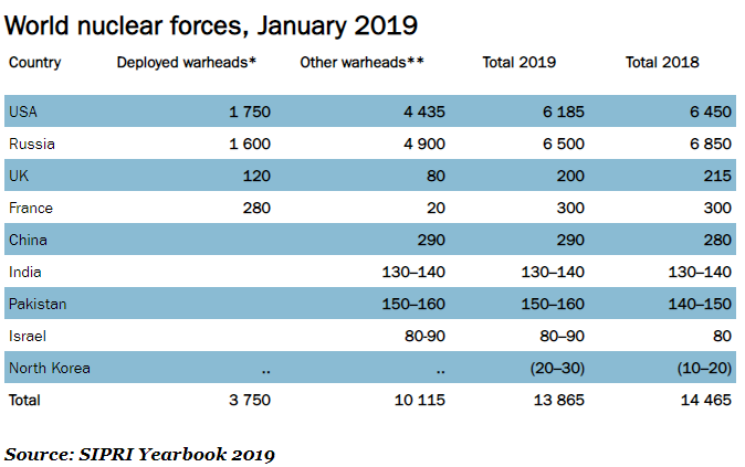 Дев'ять країн світу - США, Росія, Великобританія, Франція, Китай, Індія, Пакистан, Ізраїль і Північна Корея - за станом на початок 2019 року мали 14 465 ядерних боєголовок.