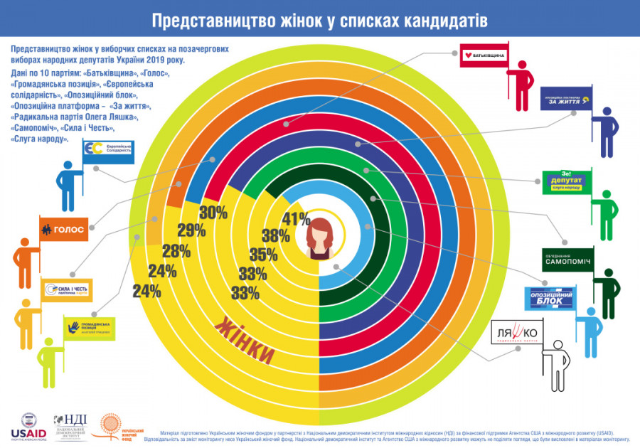 «У першій половині списків жінок вдвоє менше, ніж в другій. З шести партій, що дотримались квоти, лише «Самопоміч» має у першій половині свого списку 32% жінок. Партія «Слуга народу» в першій половині партійного списку номінувала лише 11% жінок, «Опозиційна платформа – За життя» – 16%, «Громадянська позиція» – 20%, «Батьківщина» та «Сила і честь» – по 21%. Що стосується решти партій – у «Голосу» 24% жінок в першій половині списку, в «Опозиційного блоку» та «Радикальної партії Олега Ляшка» – по 29%, і тільки у «Європейської солідарності» та «Самопомочі» – відповідно 30% та 32%», - йдеться у повідомленні.