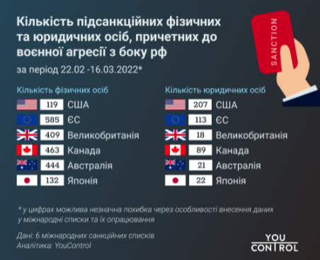 Аналітики центру R&D YouControl проаналізували санкційні списки країн США, Великобританії, Канади, Австралії та Японії, а також санкції Європейського союзу.