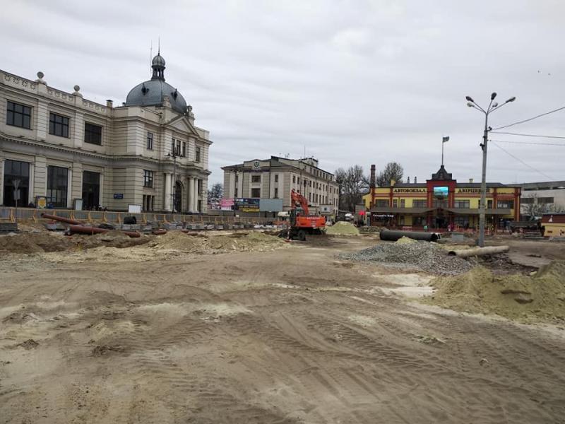 «Продовжуються масштабні роботи з реконструкції пл. Двірцевої. Підрядник нарощує темпи. Роботи з прокладання головного водогону завершили. Почали відновлення замощення парковки вокзалу. Практично завершили роботи з ліквідації споруд під старим фонтаном.