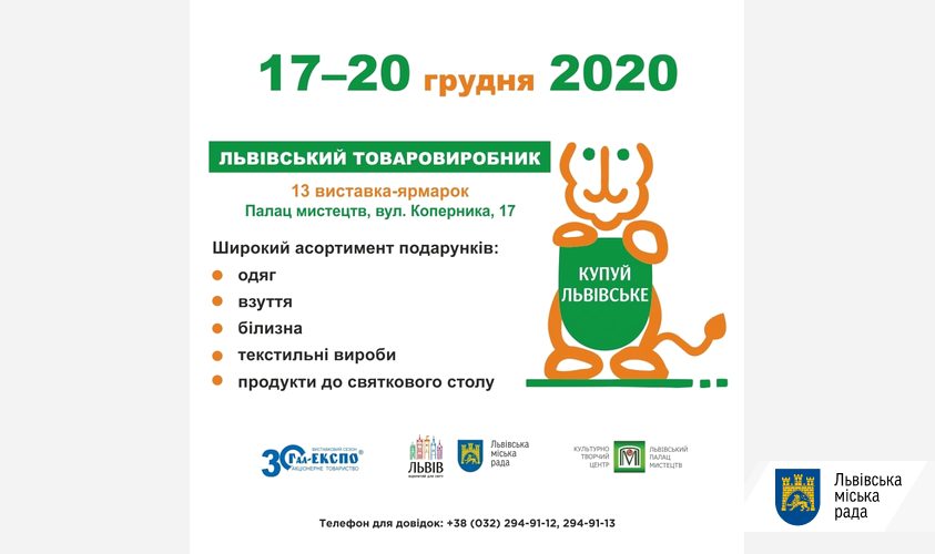 З 17 до 20 грудня у Львівському палаці мистецтв відбуватиметься виставка-ярмарок «Львівський товаровиробник», де буде представлено широкий асортимент подарунків від місцевих виробників, а саме: одяг, взуття, білизна, текстильні вироби, продукти до святкового столу та багато іншого! Підтримайте львівського товаровиробника, завітавши на виставку-ярмарок", — зазначають у відділі ділових індустрій ЛМР.