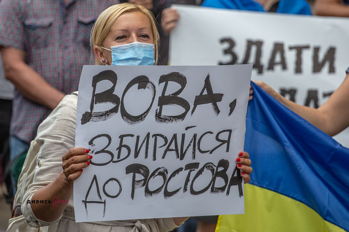 "Учасники заходу вимагали від президента Володимира Зеленського зупинити роззброєння армії та пакувати валізу до Ростова. Учасники акції також скандували гасло “Путін -х@йло, ЗЕля – си@ло”, “ЗЕлю геть”, “ЗЕля геть до Ростова”, - сказано уповідомленні.