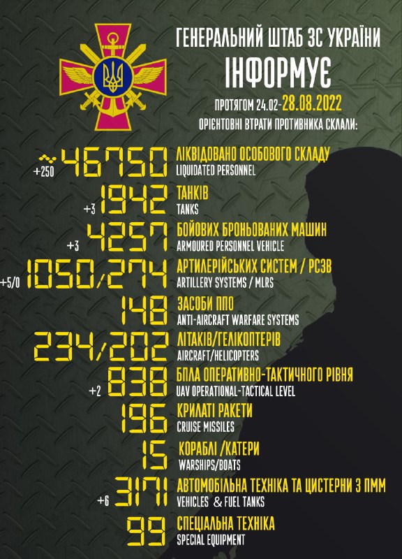 Загальні бойові втрати противника з 24.02 по 28.08- особового складу ‒ близько 46750 осіб (+250);