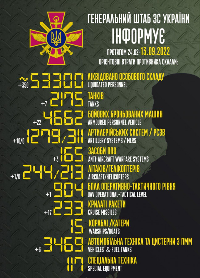 Загальні бойові втрати противника з 24.02 по 13.09 орієнтовно склали:
