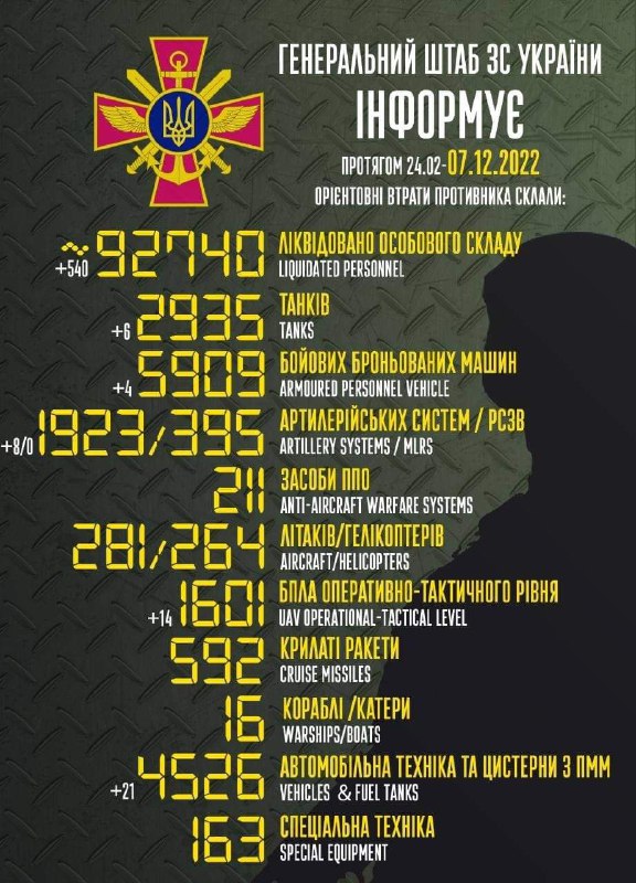 Загальні бойові втрати окупантів з 24.02 по 07.12 орієнтовно склали: