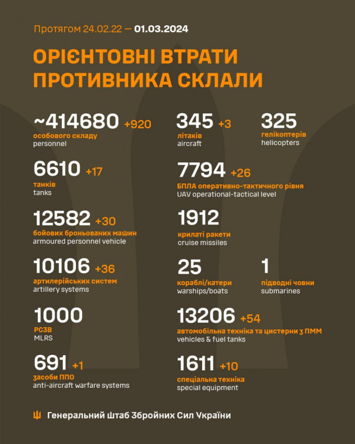 Загальні бойові втрати росіян з 24.02.22 по 01.03.24 орієнтовно склали: