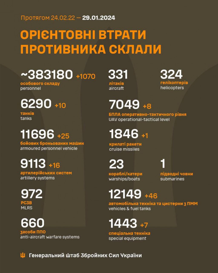 Загальні бойові втрати росіян з 24.02.22 по 29.01.24 орієнтовно склали: