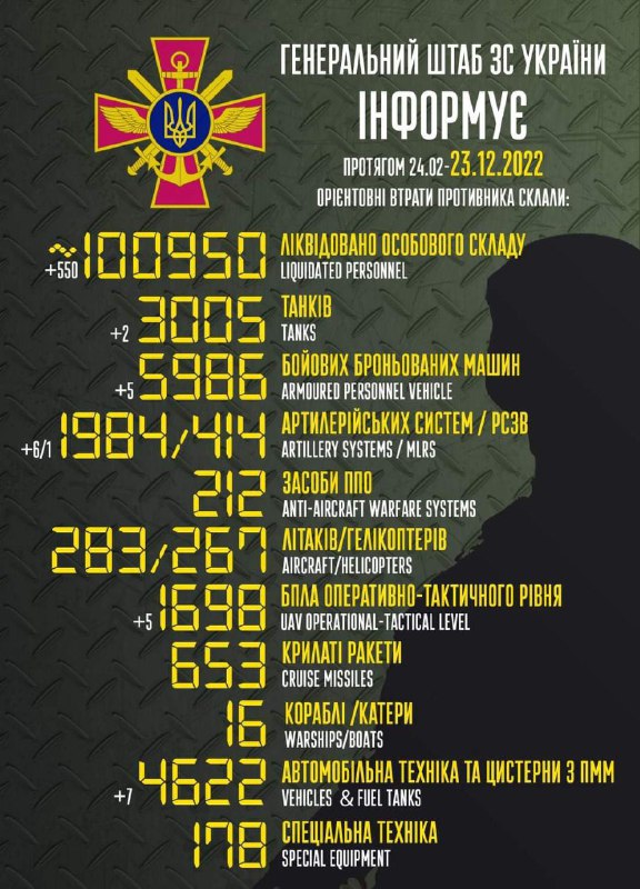 Загальні бойові втрати противника з 24.02 по 23.12 орієнтовно склали: