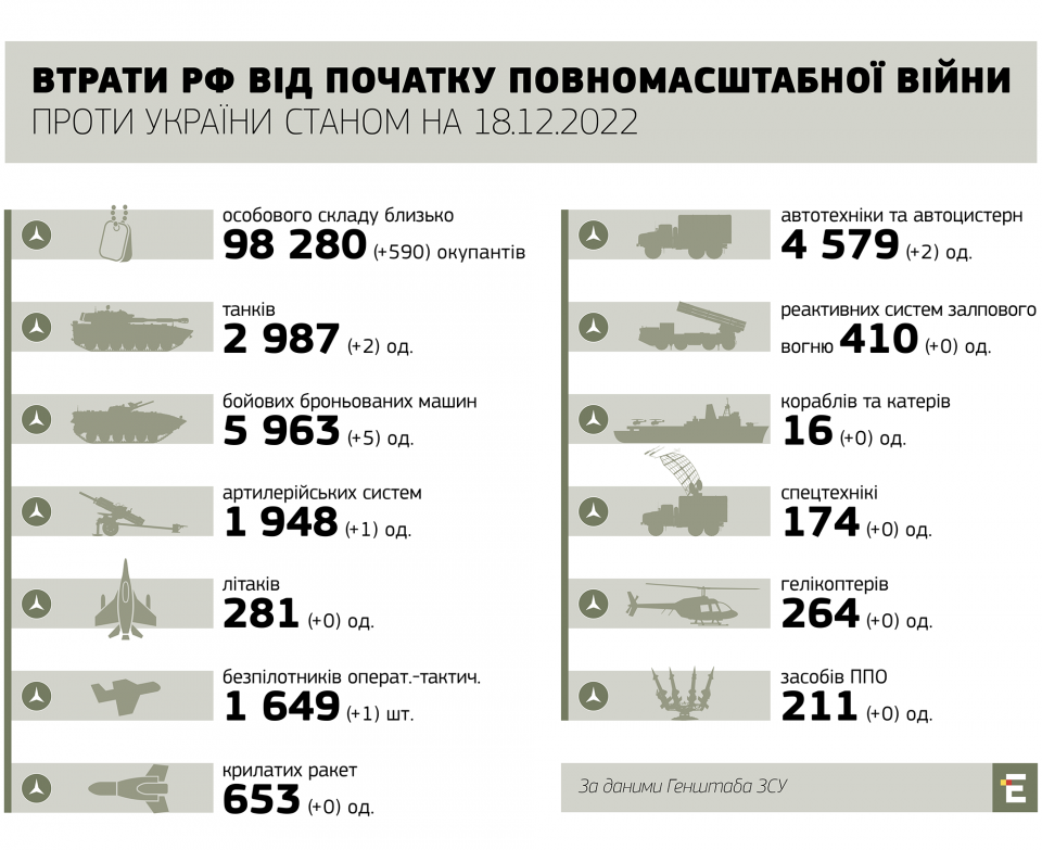 Загальні бойові втрати противника з 24.02 по 18.12 орієнтовно склали: