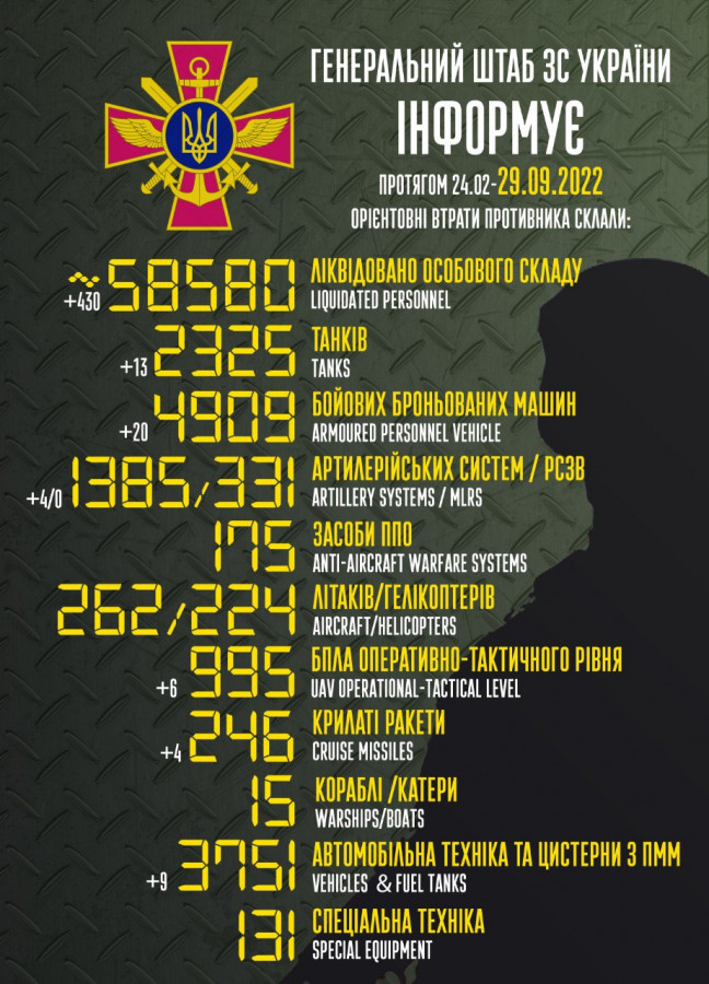 Загальні бойові втрати противника з 24.02 по 29.09 орієнтовно склали: