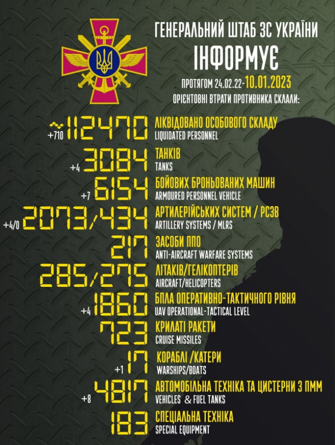 Загальні бойові втрати Росії у війні проти України з 24.02.22 по 10.01.23 орієнтовно склали: