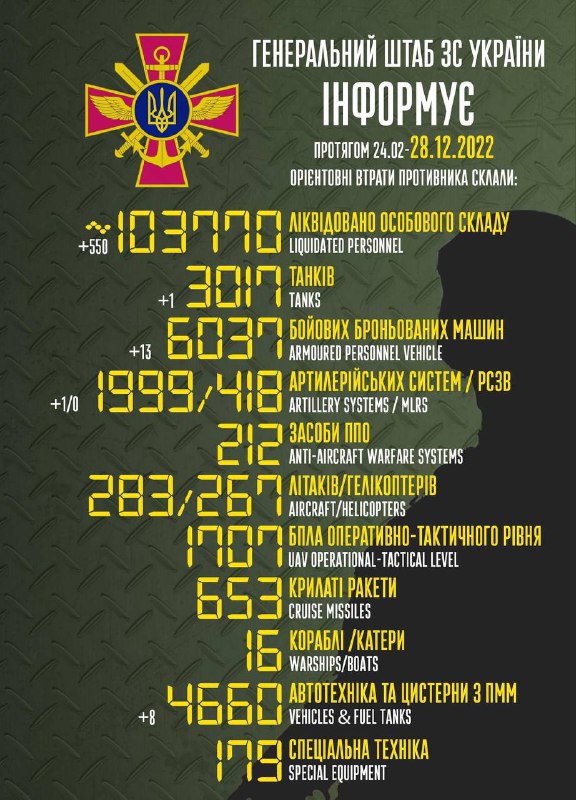 Загальні бойові втрати противника з 24.02 по 28.12 орієнтовно: