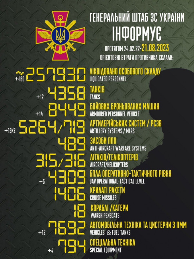 Загальні бойові втрати противника з 24.02.22 по 21.08.23 орієнтовно склали: