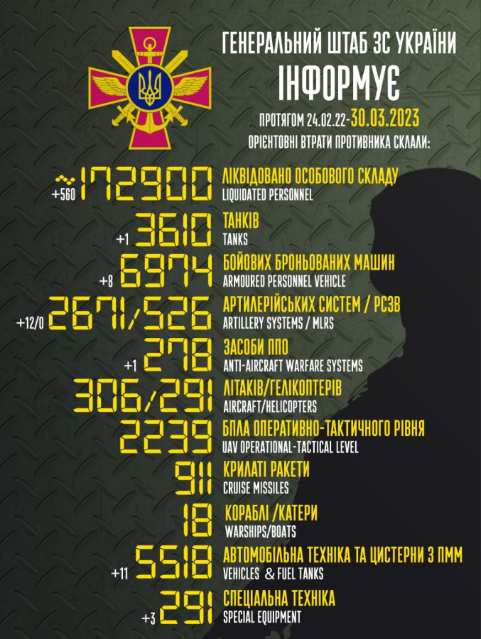 Загальні бойові втрати противника з 24.02.22 по 30.03.23 орієнтовно склали: