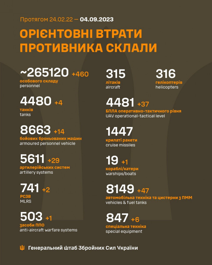 Загальні бойові втрати противника з 24.02.22 по 04.09.23 орієнтовно склали: