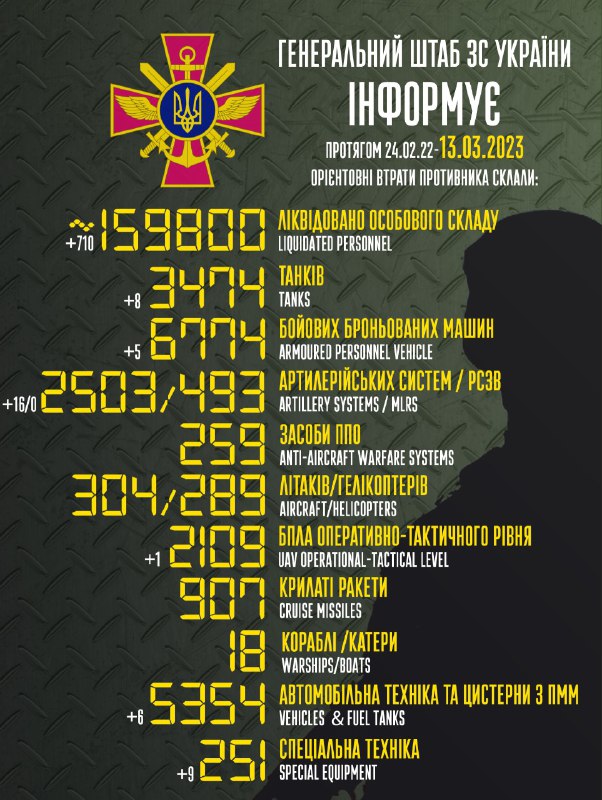 Загальні бойові втрати противника з 24.02.22 по 13.03.23 орієнтовно склали: