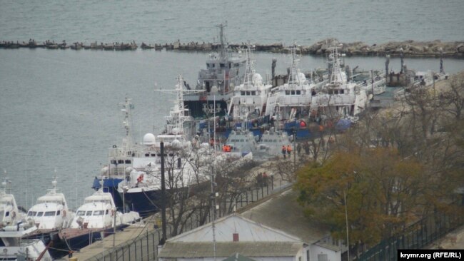 Як повідомляє кореспондент проєкту Радіо Свобода Крим.Реалії, катери в супроводі російських кораблів слідують Керченською протокою в бік Чорного моря.