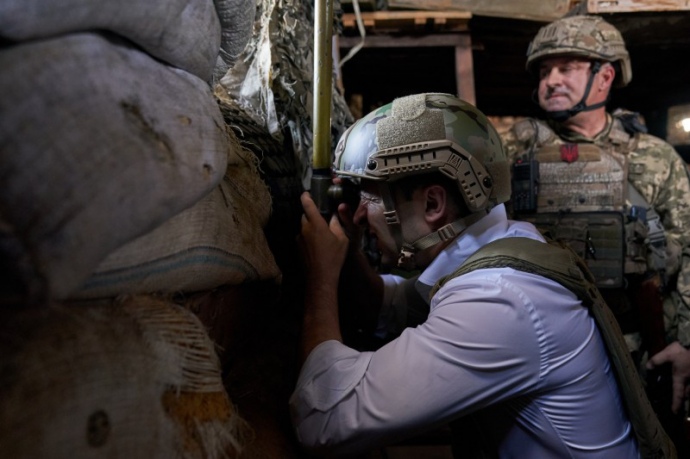 Президент Володимир Зеленський в рамках робочої поїздки на Донеччину ознайомився з ситуацією на лінії зіткнення в зоні проведення Операції об'єднаних сил, а також з умовами несення служби та проживання українських військових на передовій.