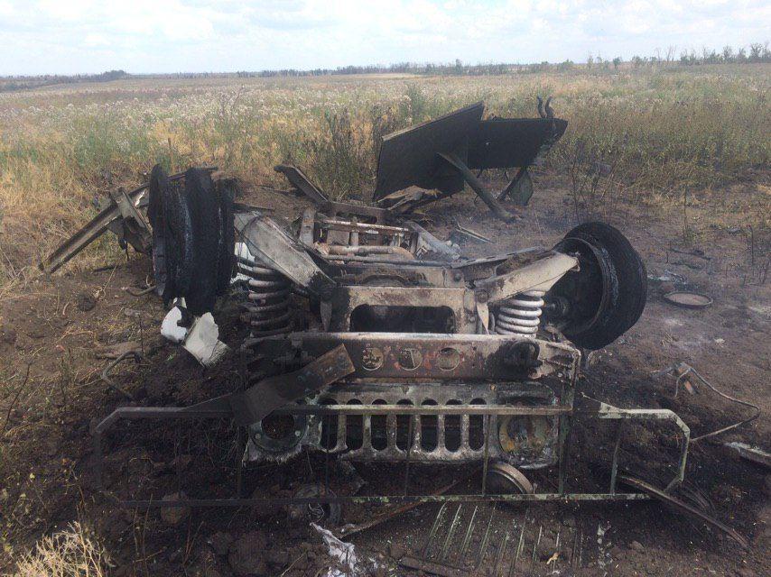 Бойовики атакували медичний “Хамер” 36-ї бригади ЗСУ під час евакуації пораненого бійця. В результаті пострілу з “ПТРК” (за попередніми даними) від автомобіля залишився один каркас.