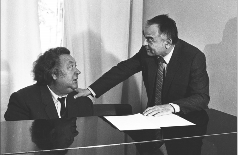 Фото - з "Творець незабутніх шедеврів", Л. В. Любарська, на фото - український композитор, народний артист УРСР О. І. Білаш (праворуч) і поет Д. В. Павличко за роботою. Київ, вересень 1987 р. Автор зйомки Ю. П. Мосенжик. ЦДКФФА України ім. Г. С. Пшеничного, од. обл. 0-213139.