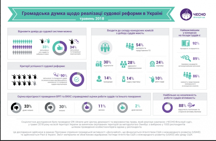 При цьому 92% опитаних громадян вважають, що запорукою успішності організації нових конкурсних відборів на посади суддів є прозорість та публічність усіх етапів конкурсу.