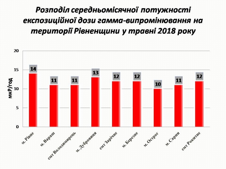 Результати досліджень, як стверджують у центрі, свідчать, що розподіл середньомісячної потужності експозиційної дози гамма-випромінювання у травні на території Рівненщини не перевищував природного фону.