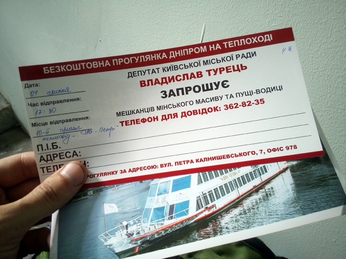 Зазначається, що кияни з Мінського масиву повідомили активістам, що депутат Київради з їхнього округу роздає через приймальню запрошення на безкоштовну прогулянку теплоходом річкою. Відповідні оголошення були розклеєні на будинках.