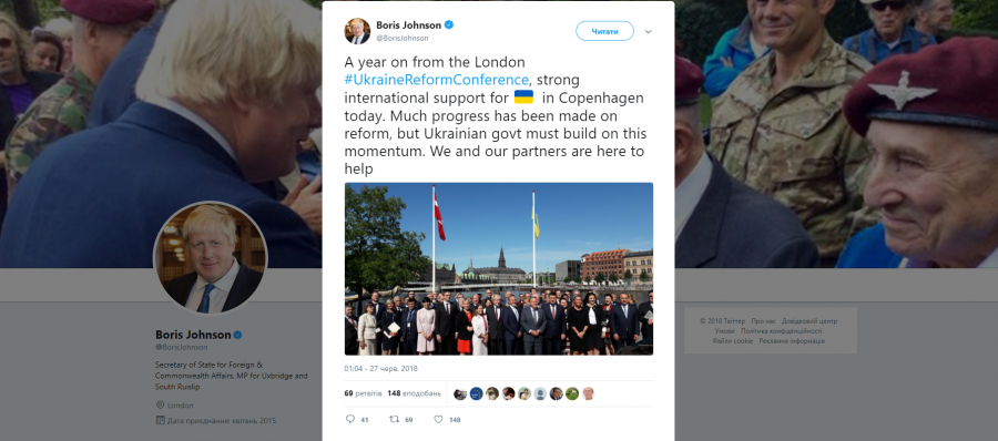 Про це міністр закордонних справ Великої Британії Борис Джонсон заявив 27 червня на Другій міжнародній конференції з питань реформ в Україні, яка відбувається в столиці Данії Копенгагені, пише Радіо Свобода.