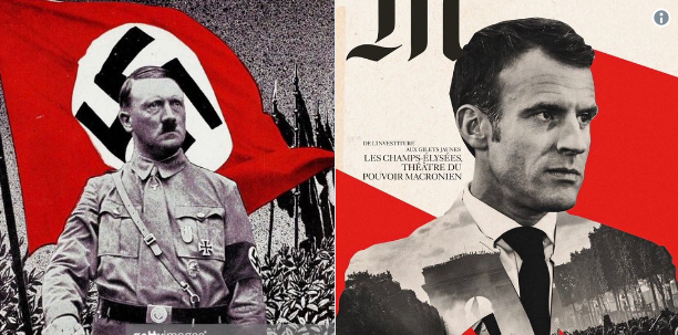 Обкладинка журналу, який випускає редакція Le Monde, у суботу вийшла з зображенням Макрона у напівпрофіль (так часто на агітплакатах нацистів зображали Гітлера) на червоному і білому тлі, яке нагадує прапор нацистів. Стилізована літера M у назві журналу може викликати асоціації зі свастикою.